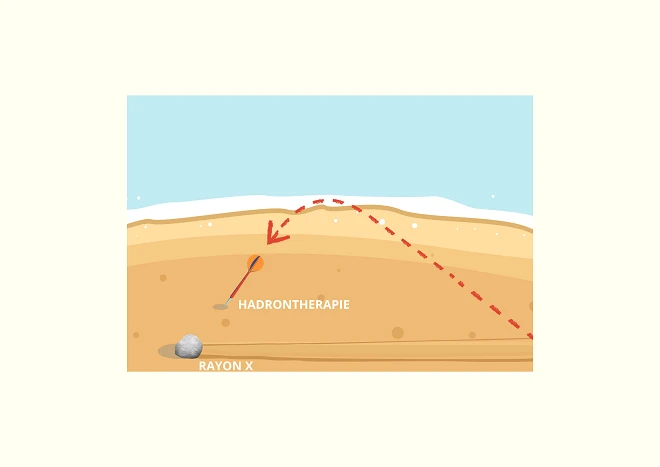 Imaginez que vous vouliez comparer les rayons X – le galet - et des particules lourdes (type protons et ions carbone) – une fléchette – sur le sable d’une plage normande :