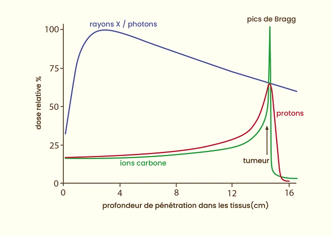 Les particules de l’hadronthérapie, elles, déposent l’essentiel de leur énergie directement dans la tumeur et beaucoup moins avant/après.